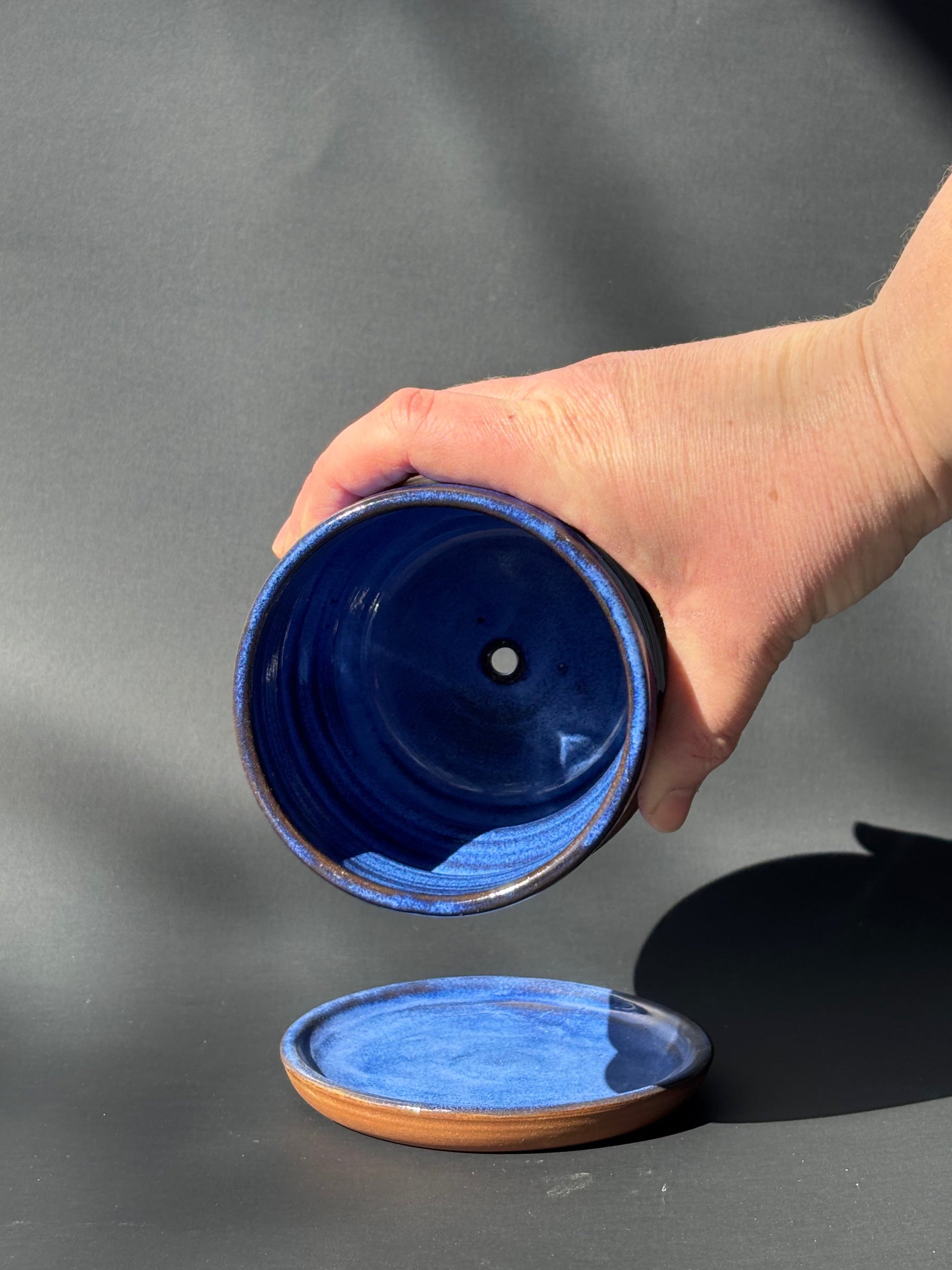 Curvy planter and tray made of red clay. Glazed with a cobalt blue glaze.