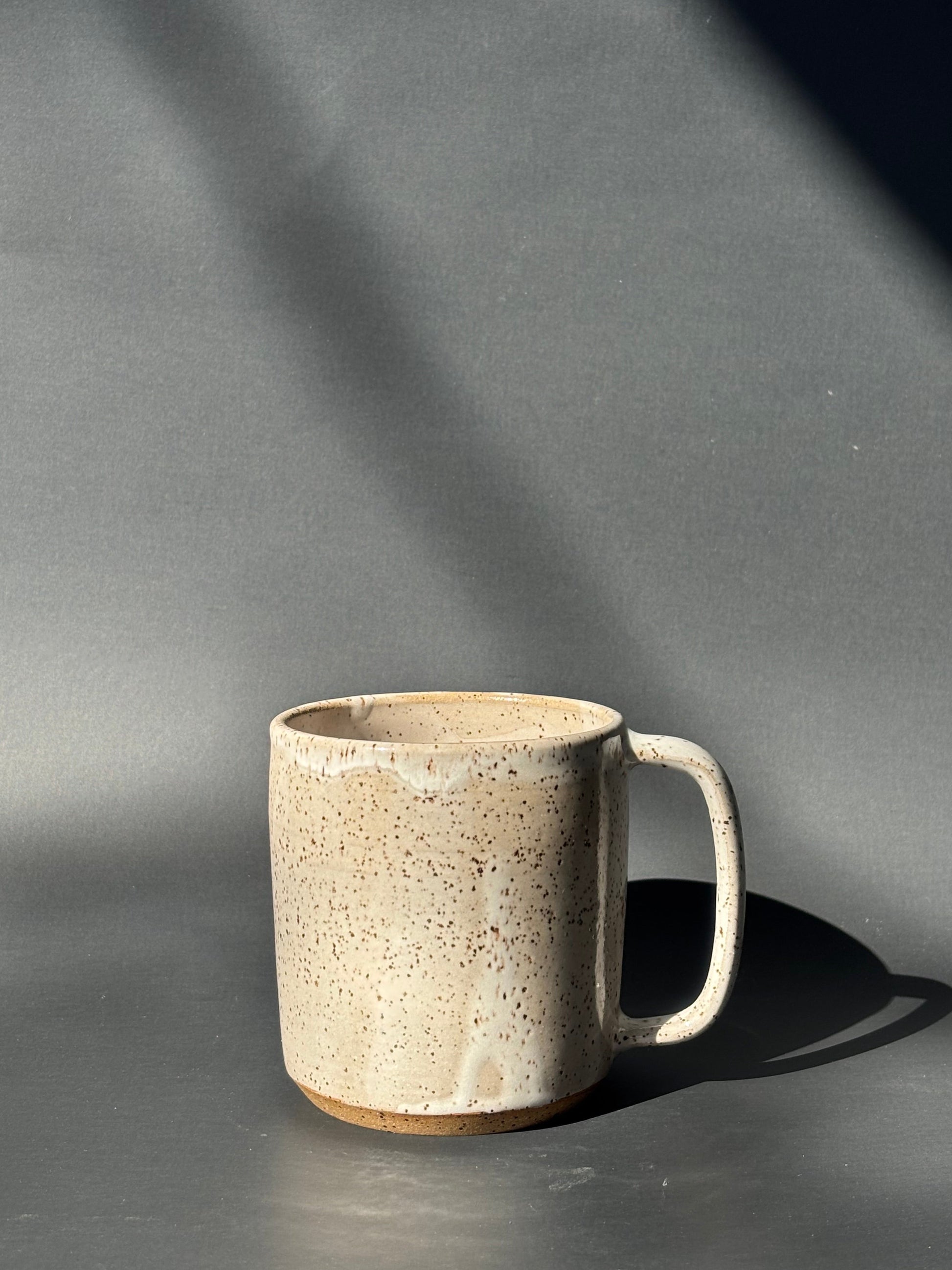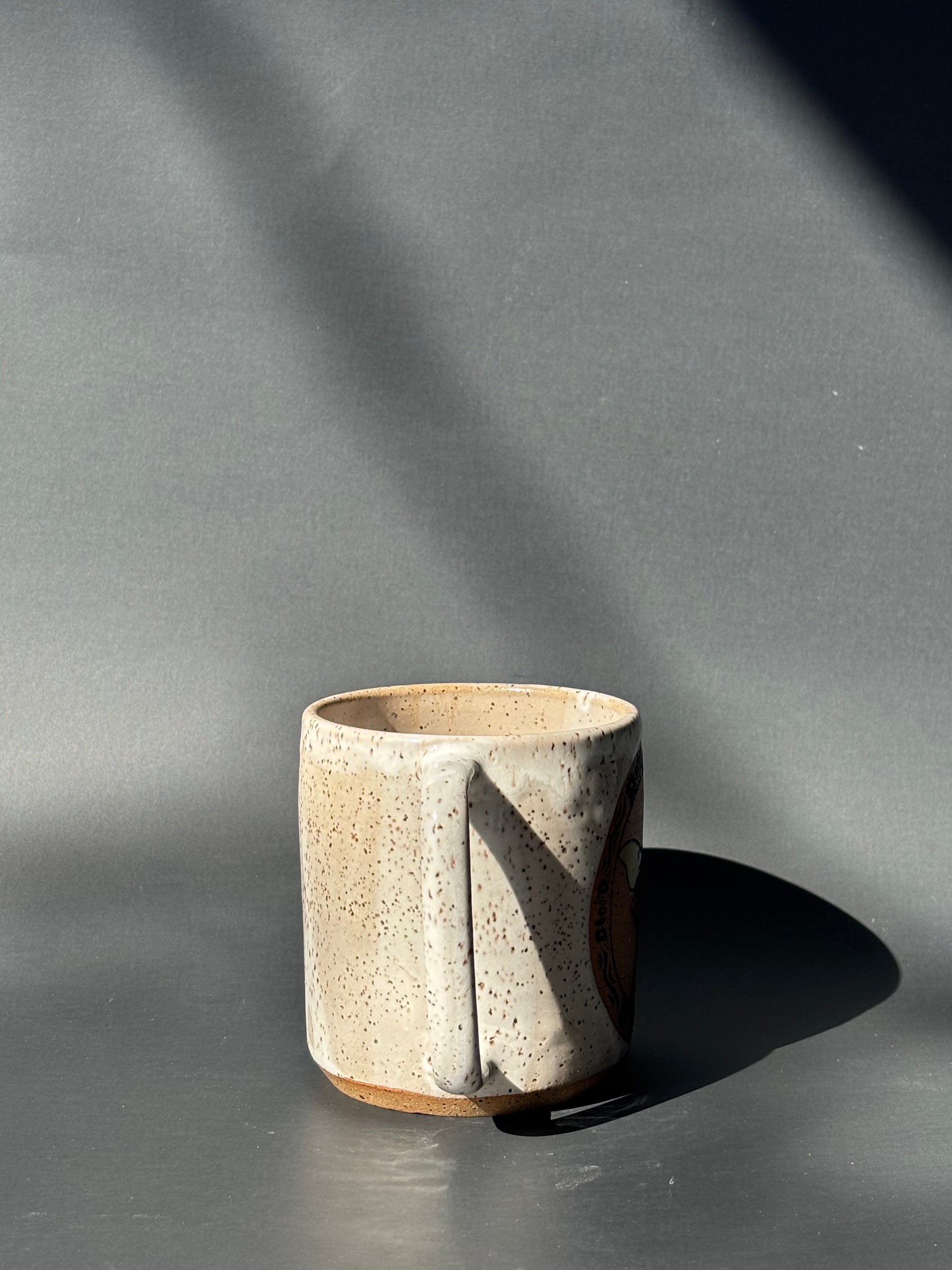 Mug made of speckled clay with white glaze, with framed luna moth design screenprinted on one side and glazed green.