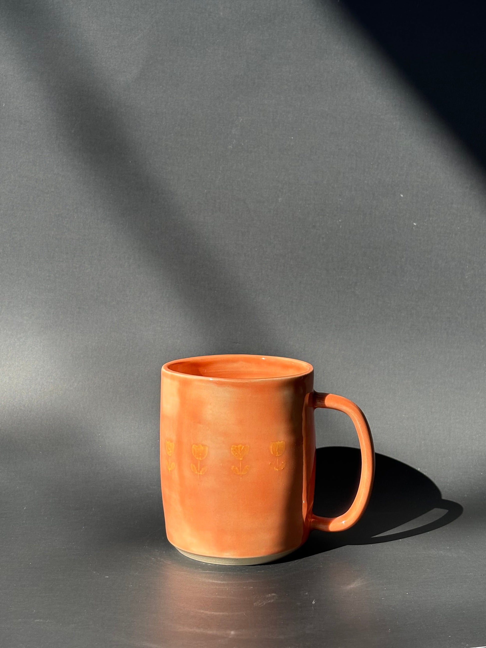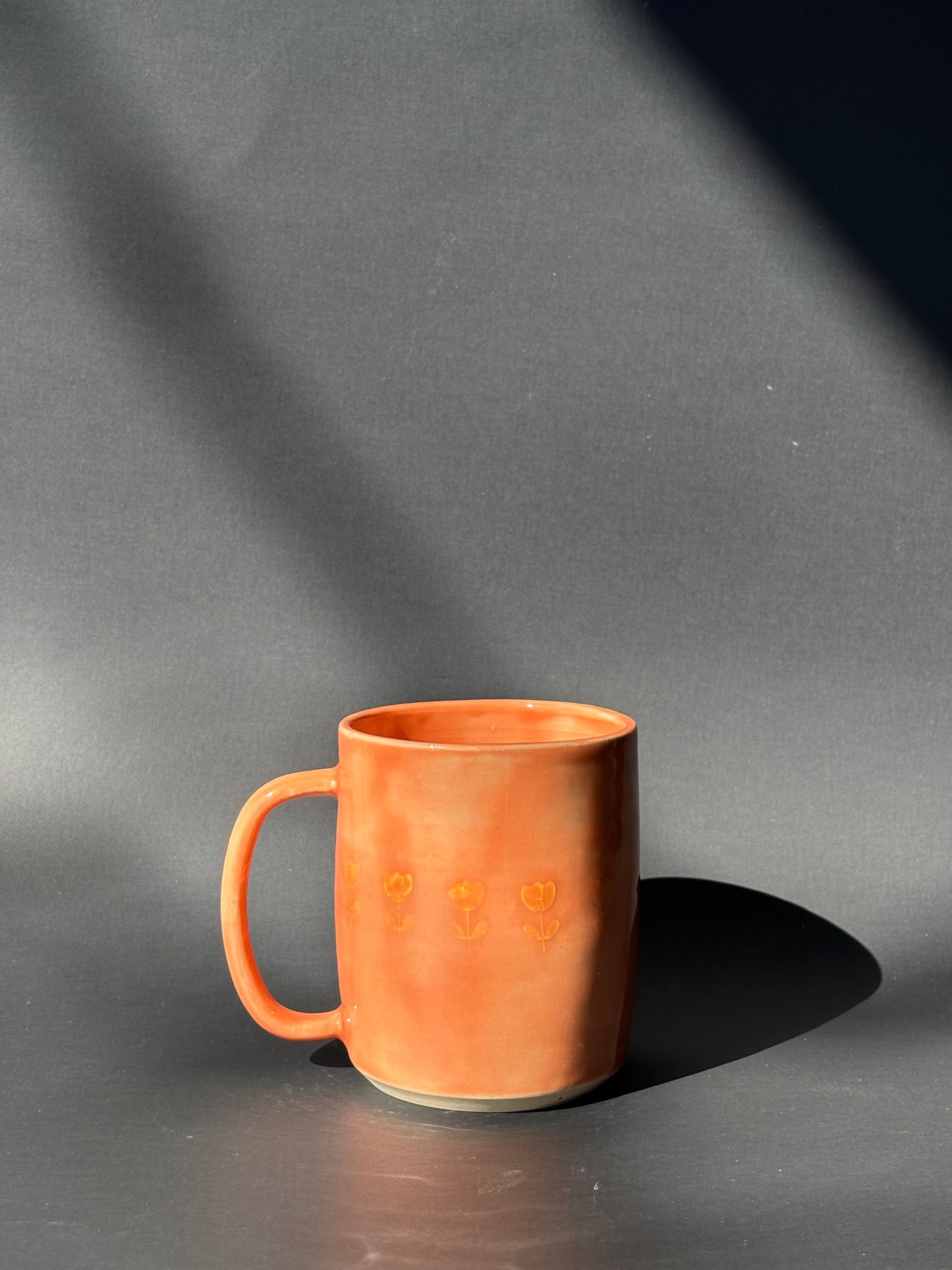 Mug made of white clay with pink orange transparent glaze. Yellow tulips applied in slip underneath the glaze around the mug.