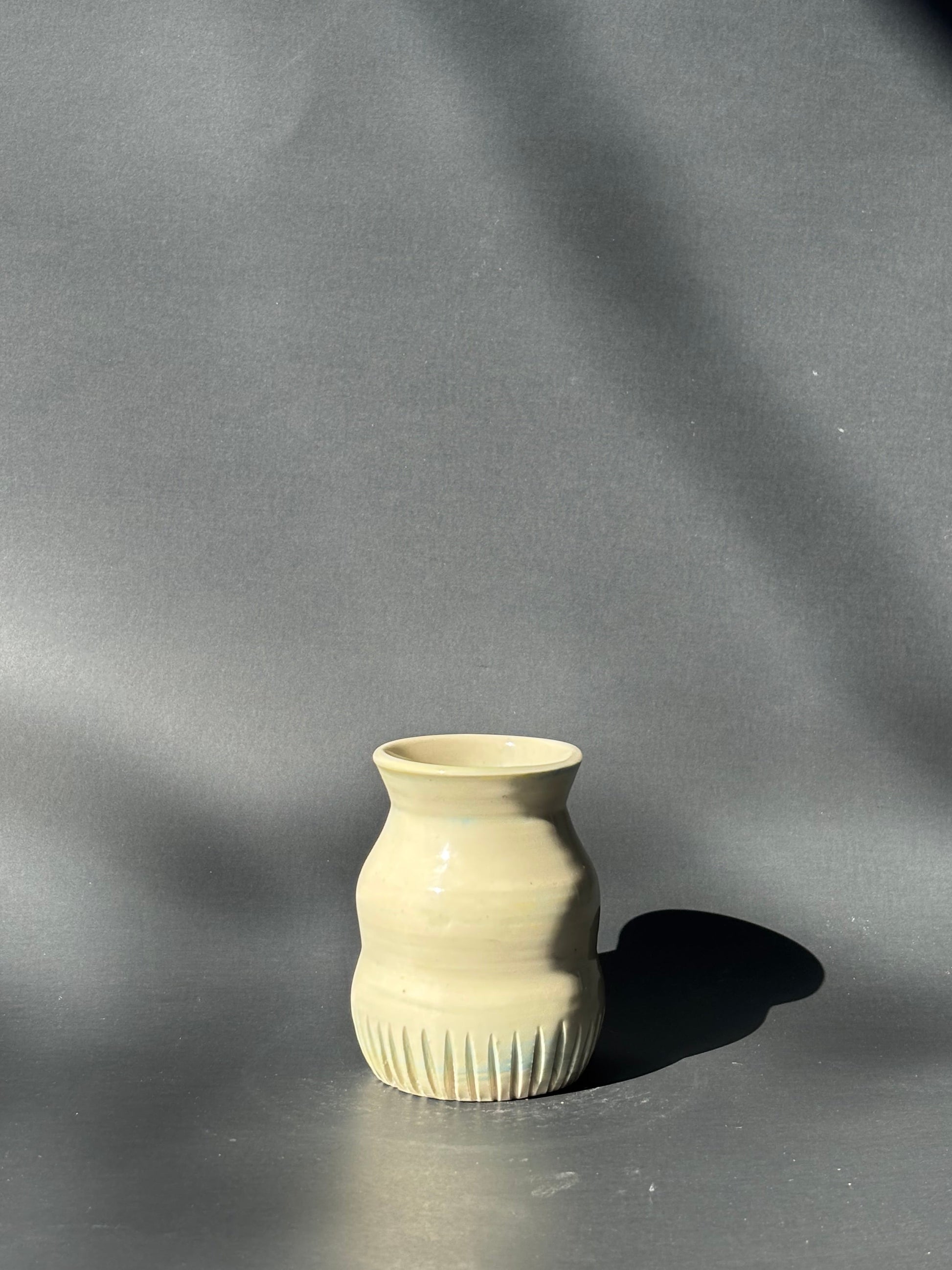 Mini Vase made of white clay with yellow teal and blue clay swirls, and carving around bottom. Clear Glaze.