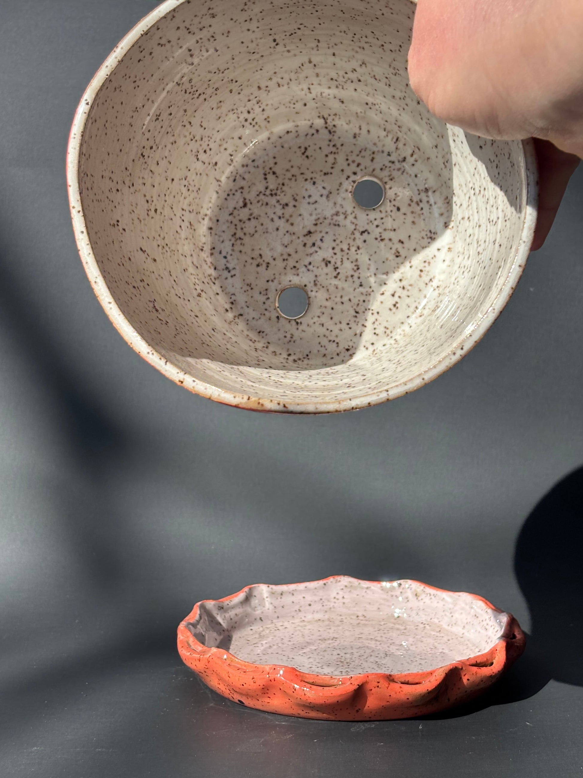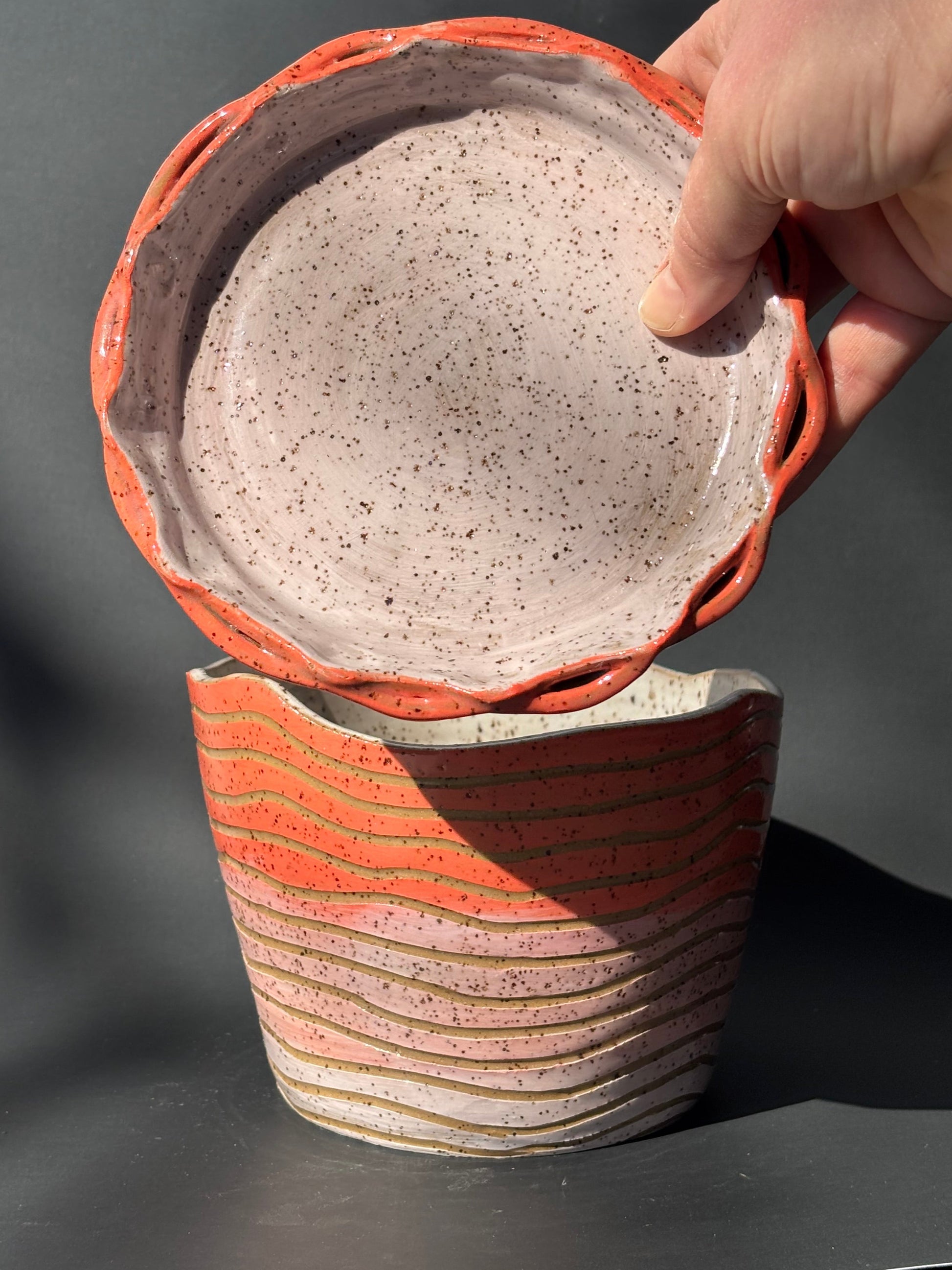 Planter made of speckled clay with white glaze inside. Uneven carved rim, ombre colored slip on the outside carved through, and topped with clear glaze. Drip tray has double rim pinched together to make scallops, decorated with colored slip and covered with clear glaze.