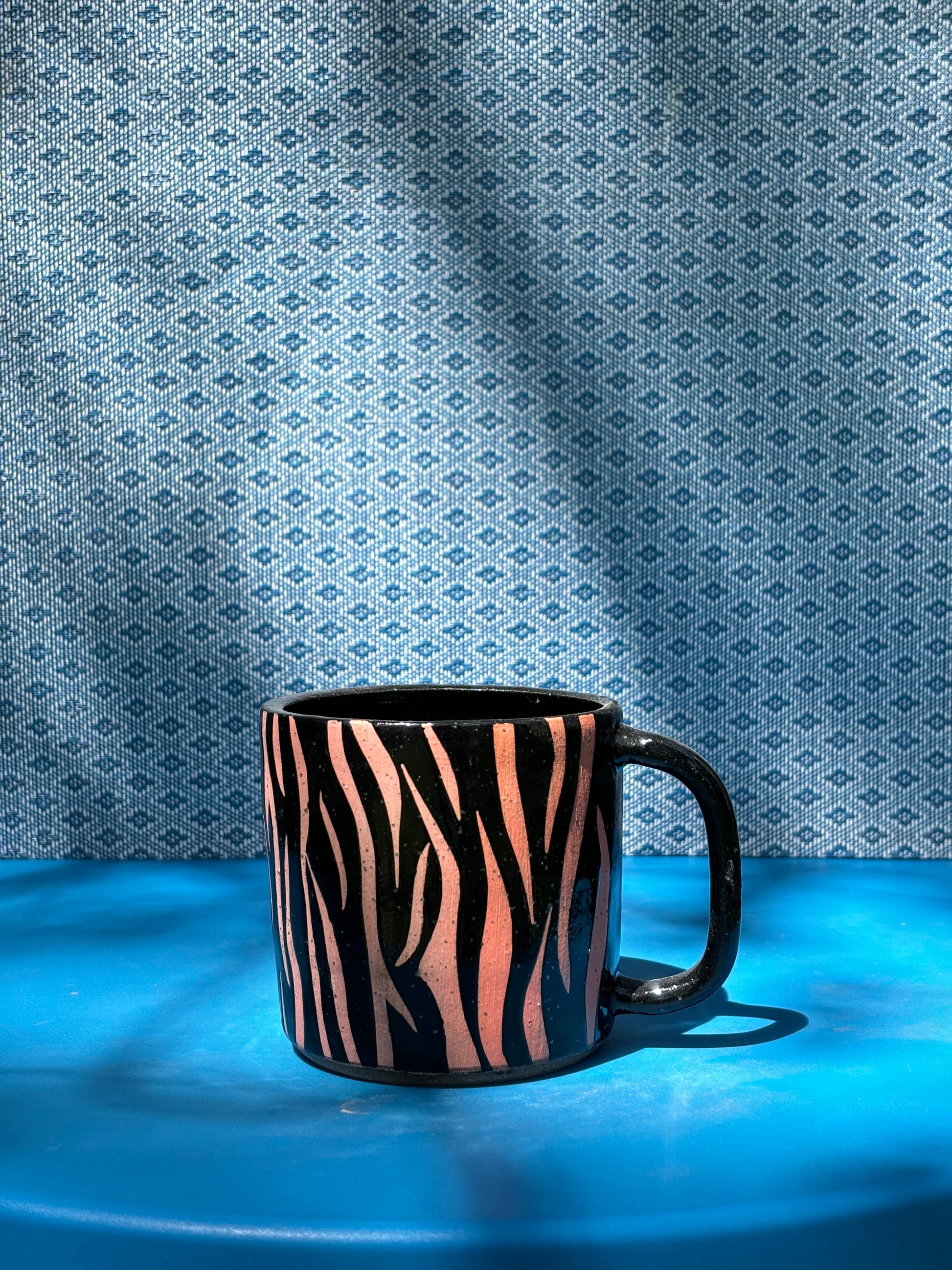 Mug with ombre purple to orange colored slip around, inverse tiger stripe design over it. Black glazed handle and inside.