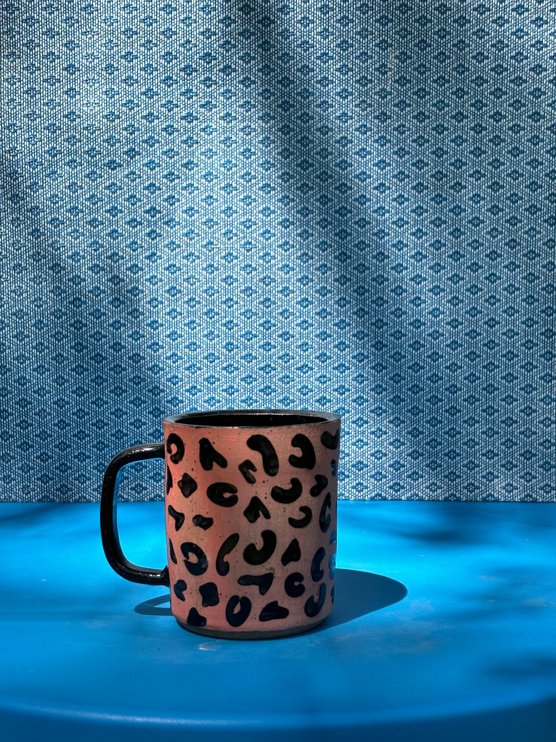 Mug with ombre pink to purple colored slip around, glazed cheetah print design over it. Black glaze handle and inside.