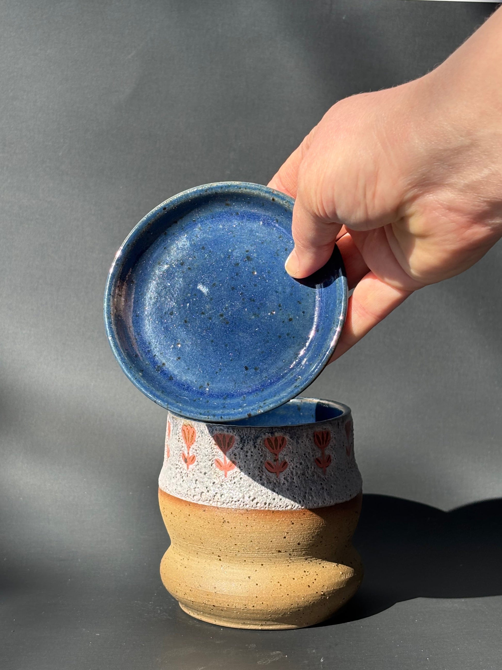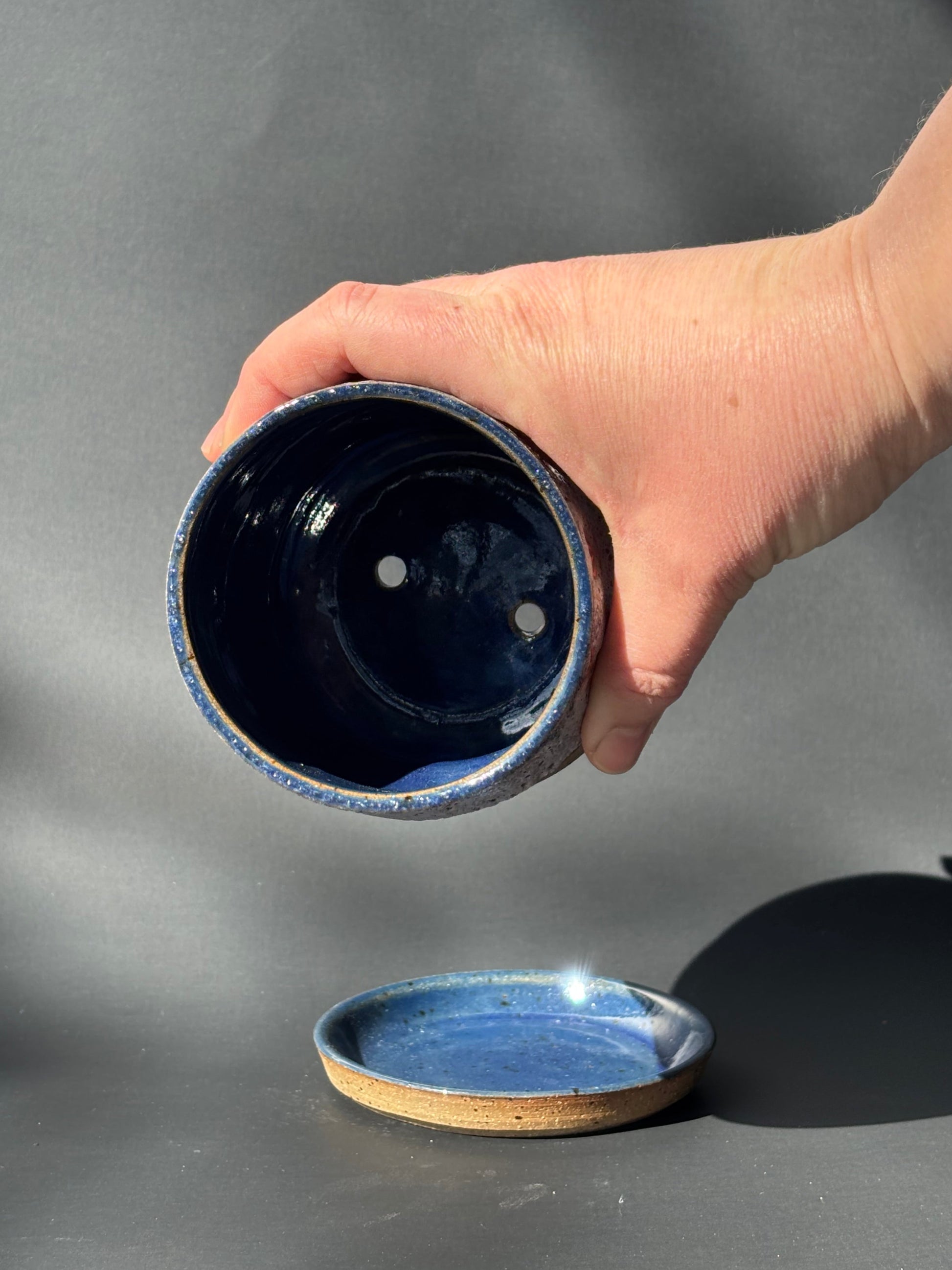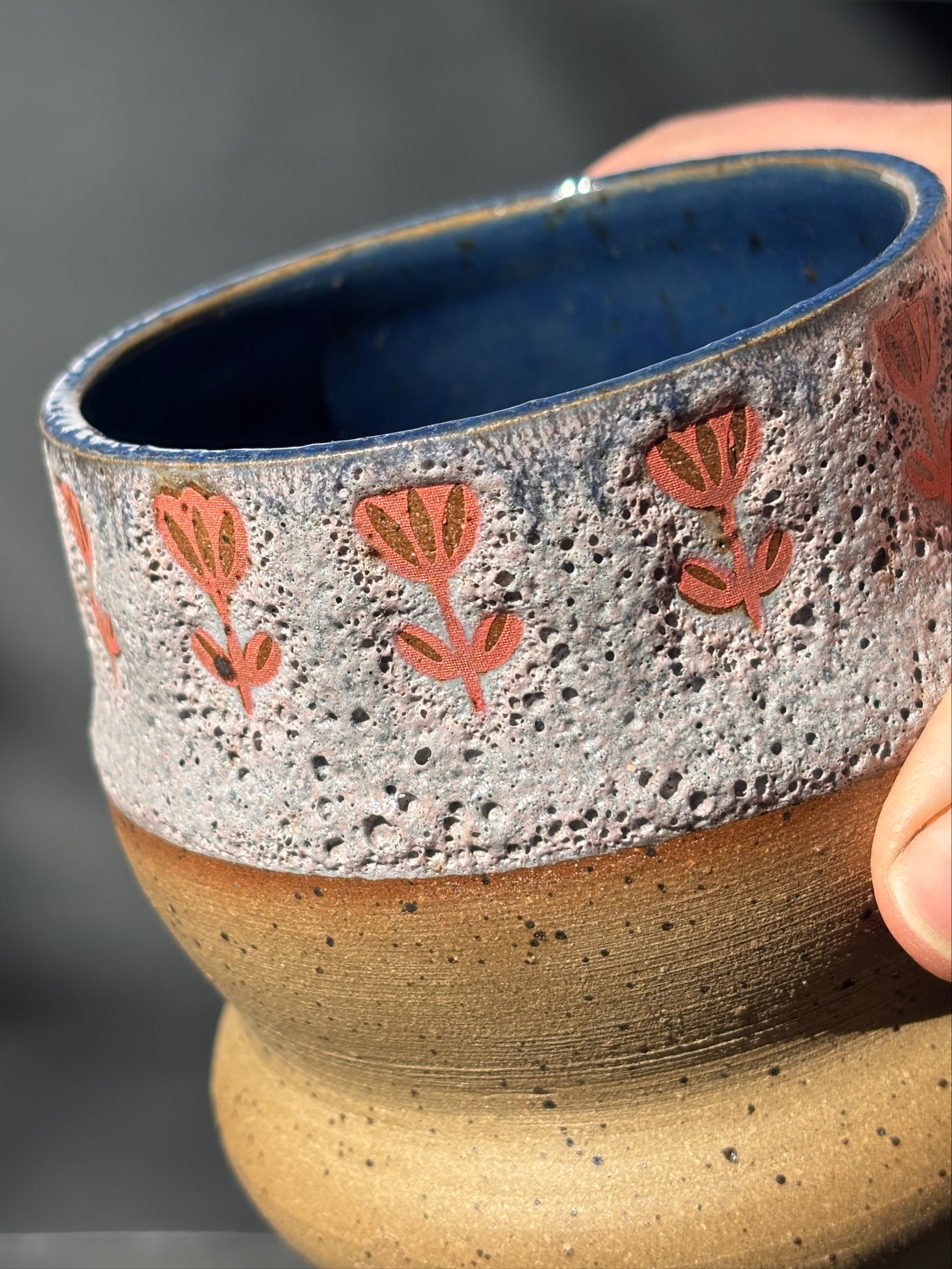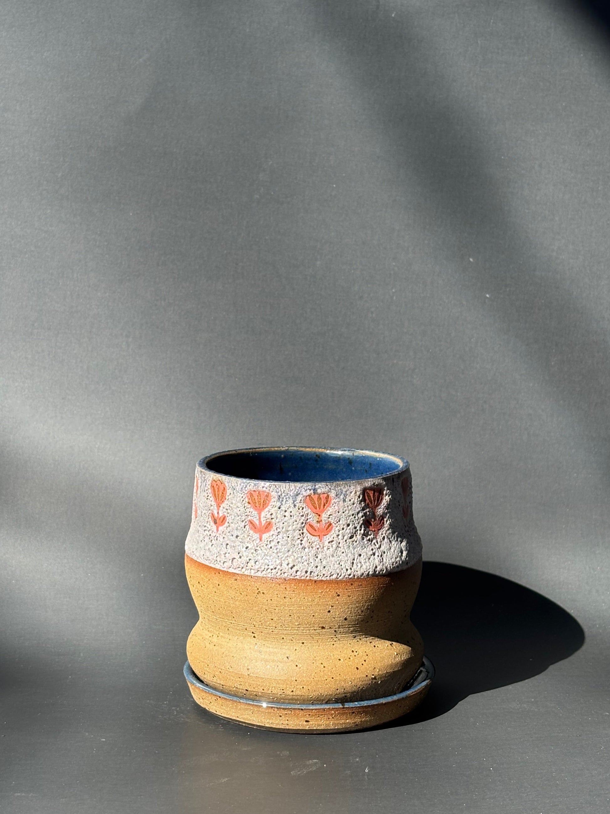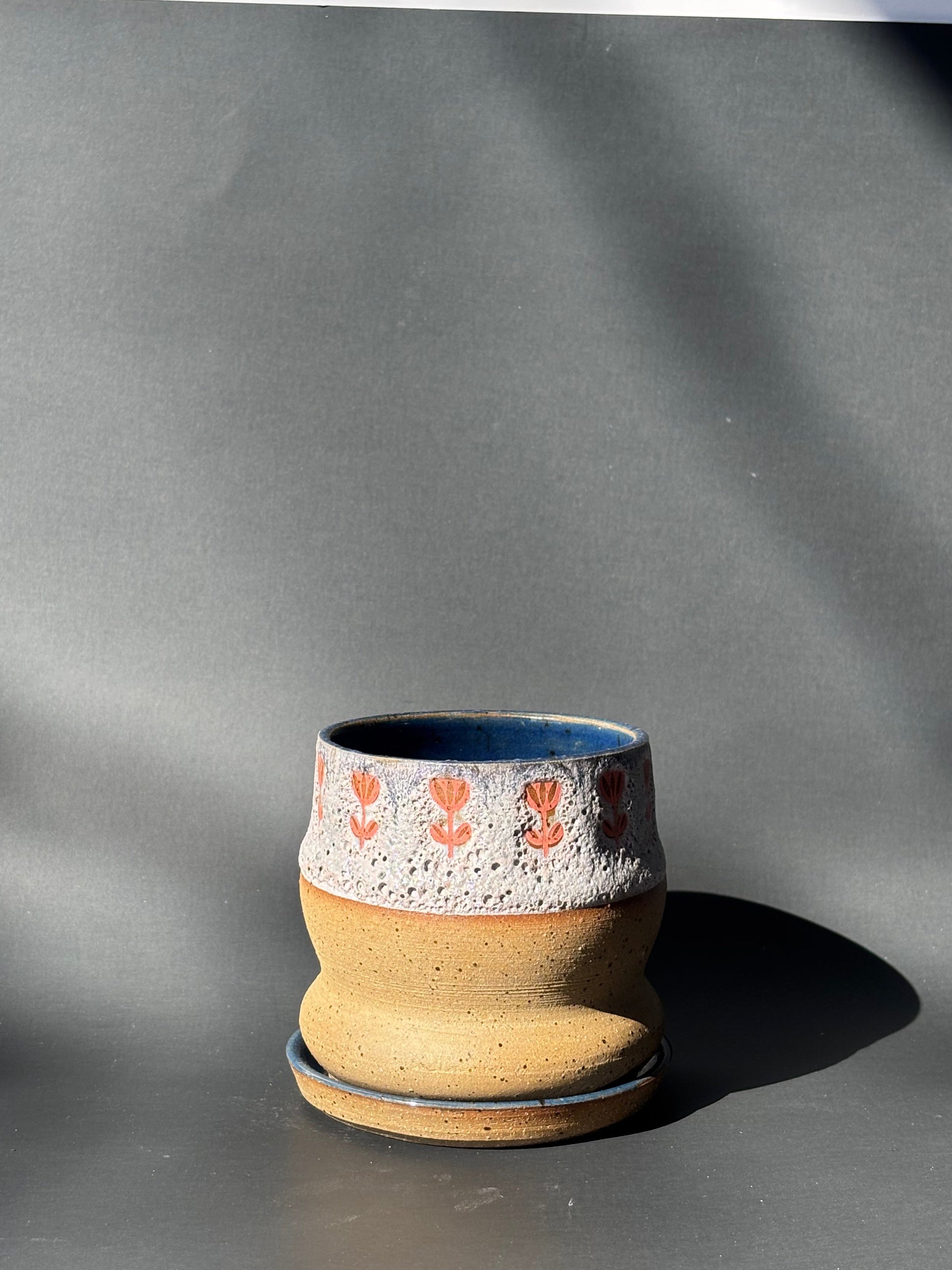 Curvy planter and tray made of speckled clay. Screenprinted pink tulips around the top of the planter, dark blue glaze inside and on the plate, and a puffy purple lava glaze around the tulips.